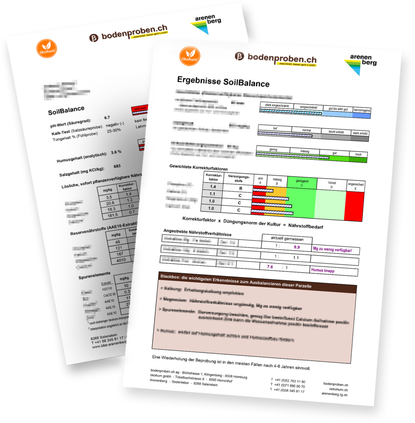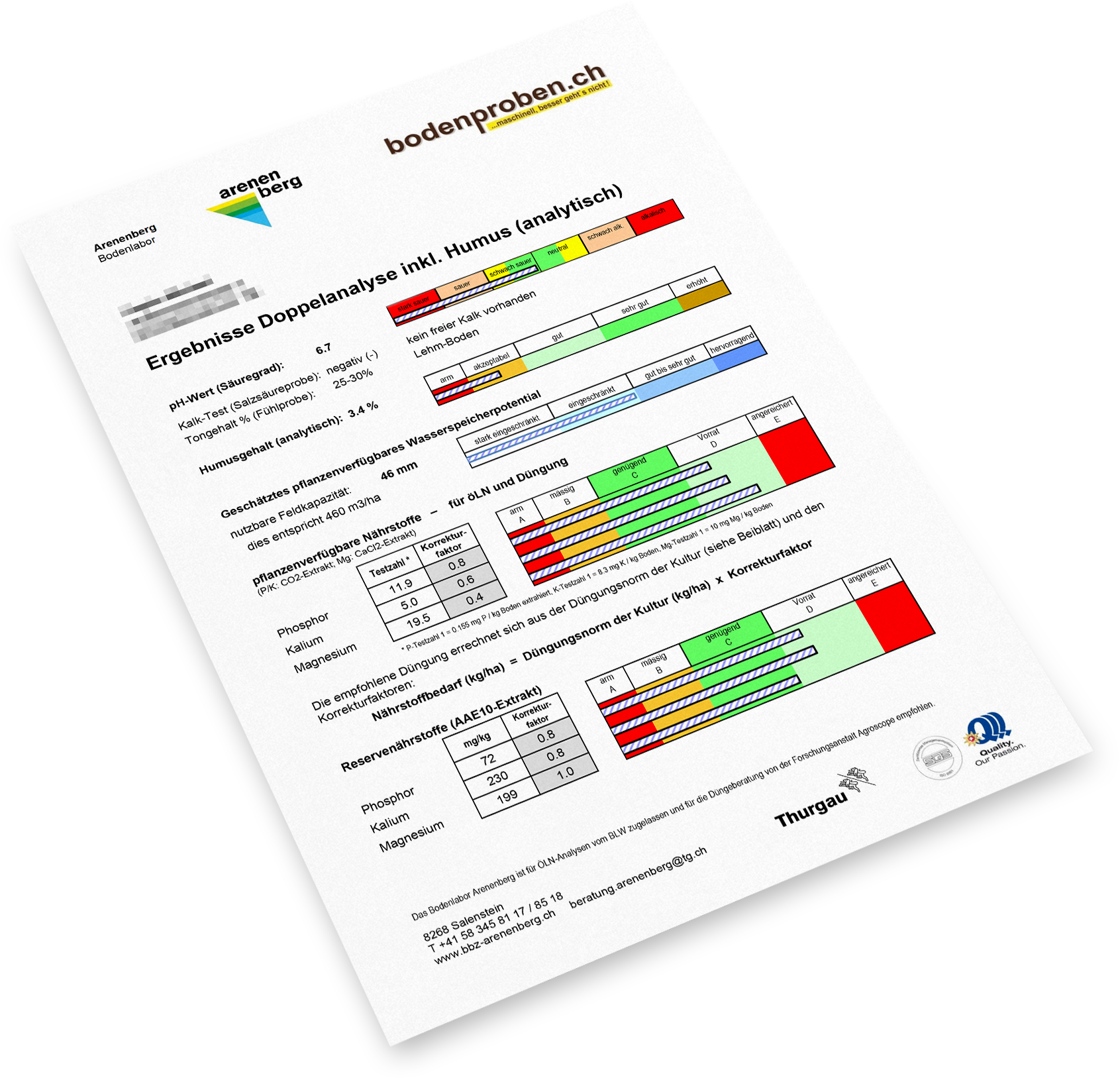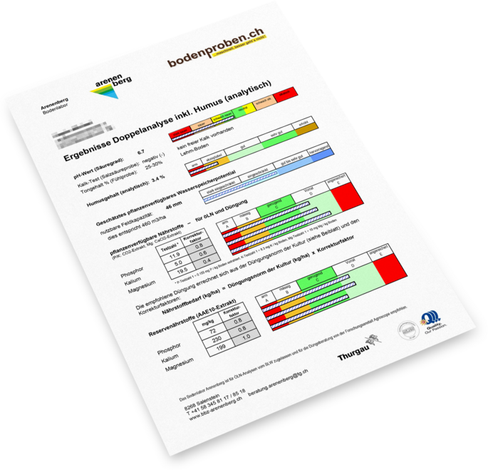 Alle Hauptnährstoffe, pH-Wert, Spurenelemente, Kalk-Test, Ton, Humus analytisch, pflanzenbauliche Hinweise, konkrete Empfehlungen